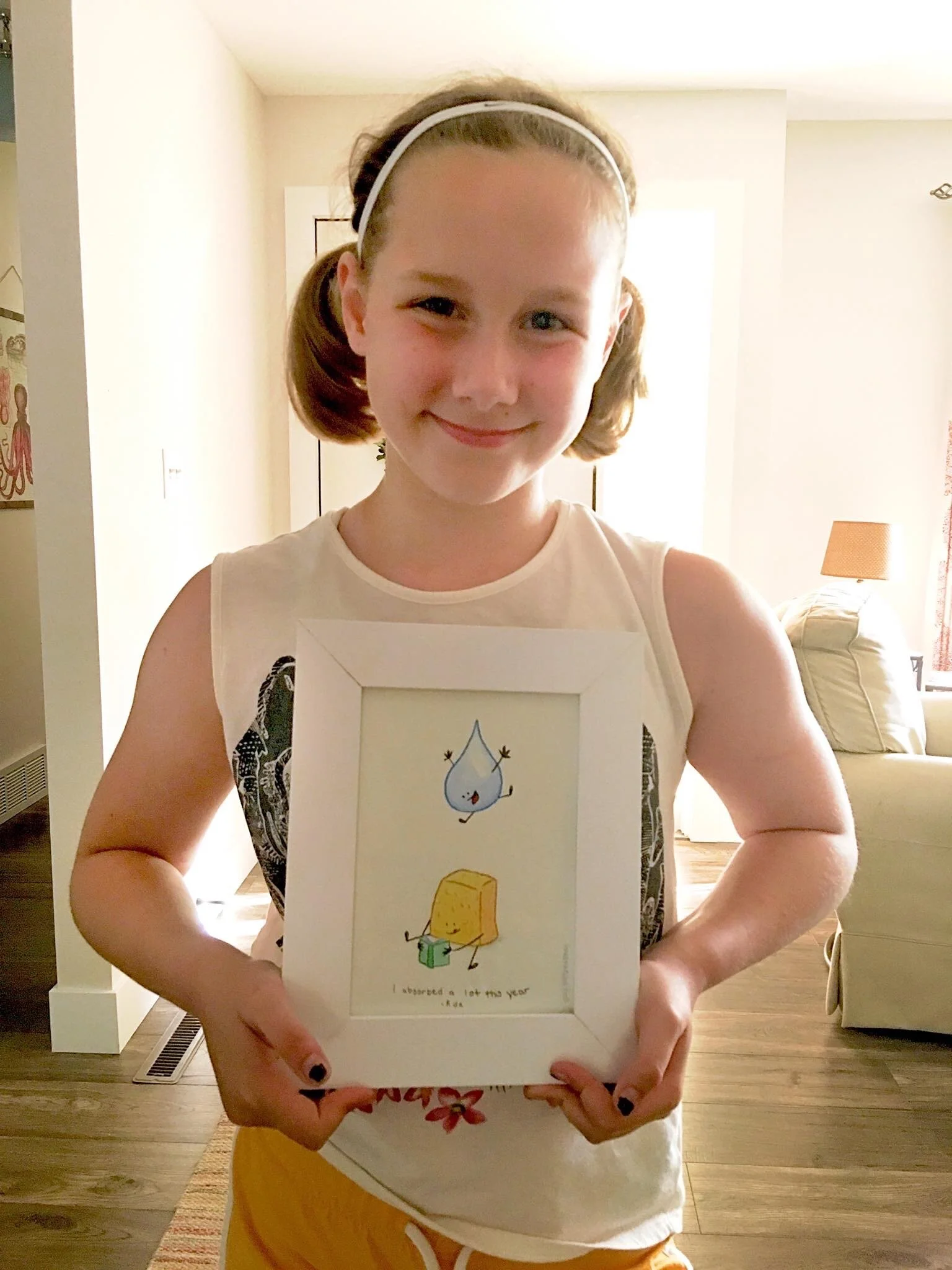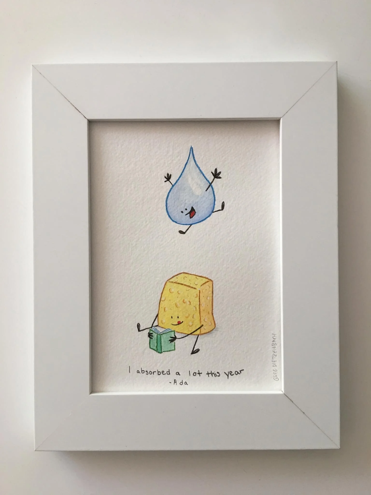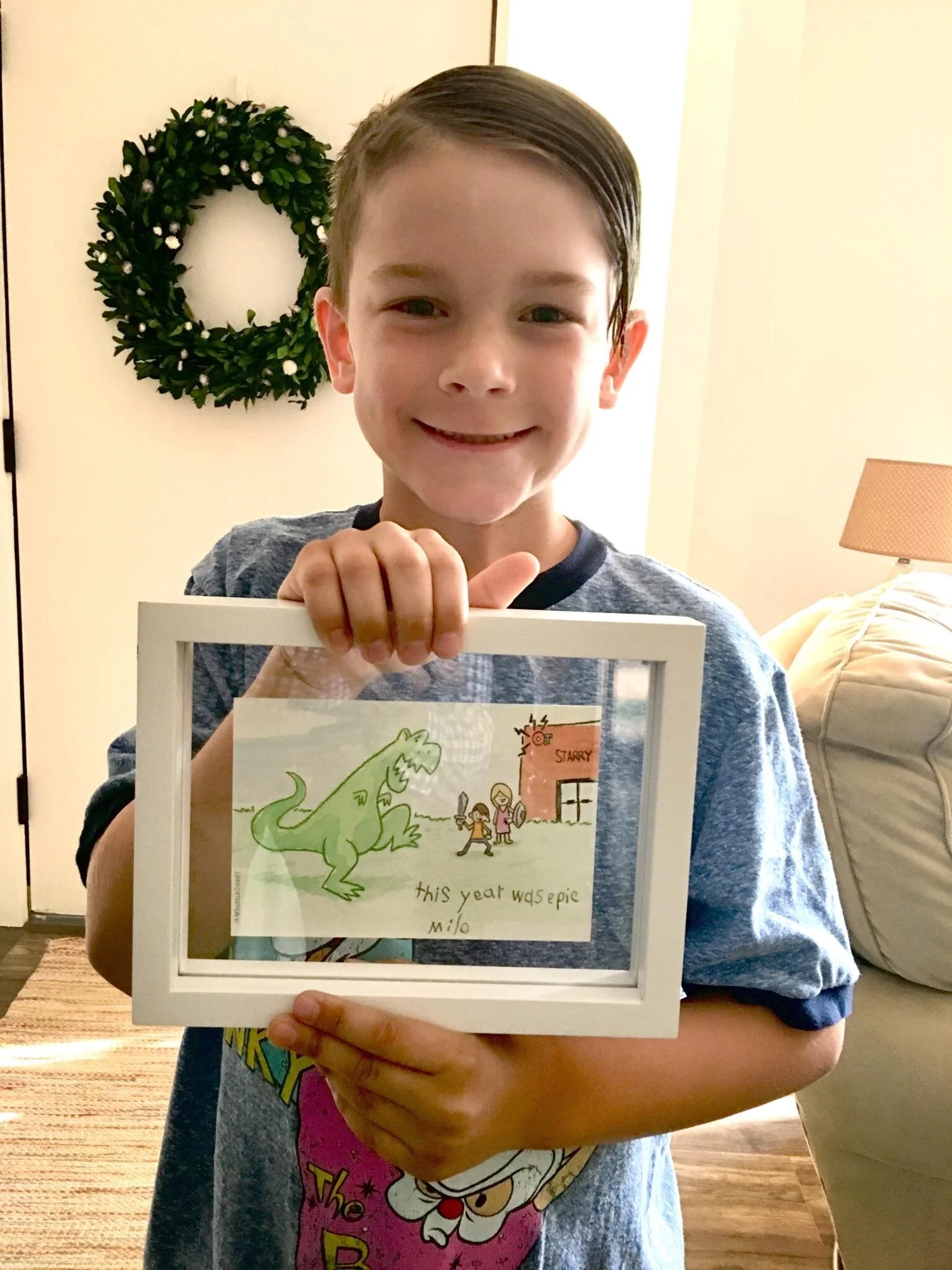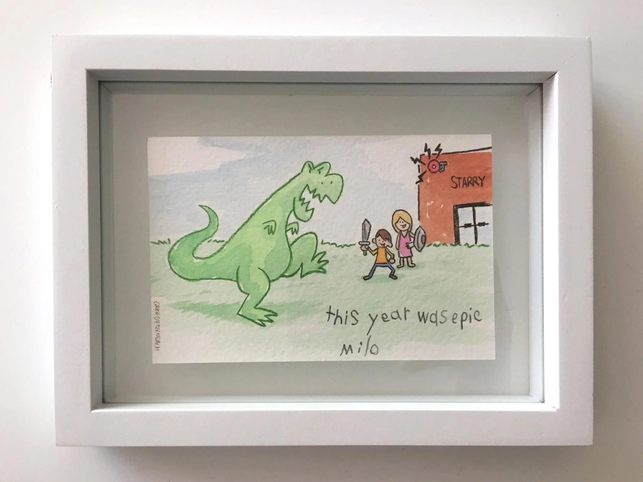 Ada is a smart little sponge. Milo wanted an illustration of him and his teacher fighting a dinosaur while the final bell rang. He also came up with the message.
